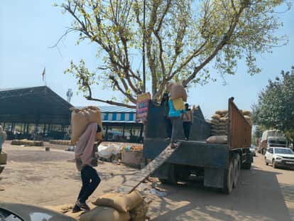अनाज मंडी में फसल का उठान करते श्रमिक। संवाद