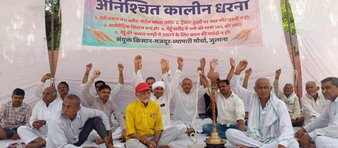 06जेएनडी16: जुलाना की नई अनाजमंडी के बाहर धरने पर नारेबाजी करते हुए किसान। स्रोत किसान