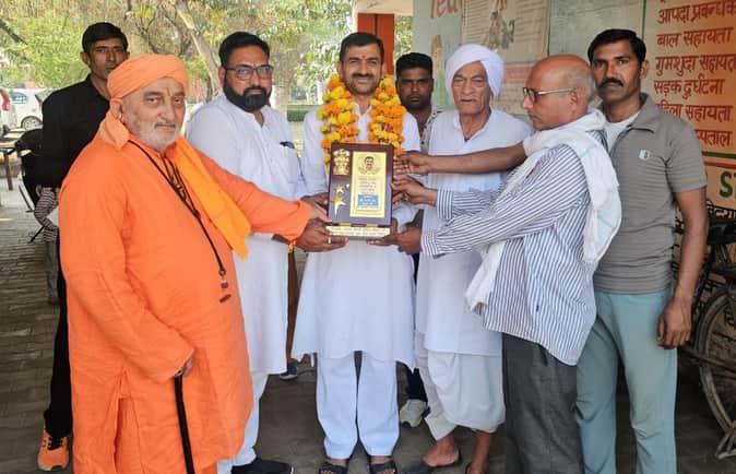 24जेएनडी22-प्राचार्य श्याम देव आर्य को सम्मानित करते हुए ग्राम पंचायत। स्रोत: ग्रामीण