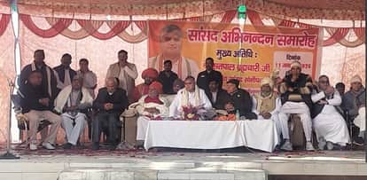 11जेएनडी17: अभिनंदन समारोह में मंच पर मौजूद सांसद सतपाल ब्रह्मचारी व अन्य समाज के लोग। संवाद