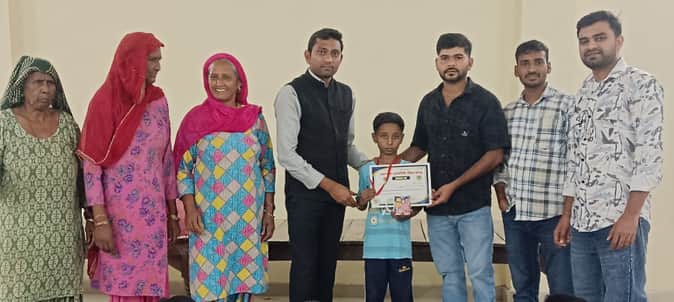02जेएनडी08: स्कूली परीक्षाओं में प्रथम स्थान पर आने वाले बच्चों को सम्मानित करते हुए सुमित हमीर