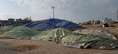 07जेएनडी30: नईं अनाज मेला मंडी में तिरपाल से ढके हुए गेहूं के ढेर। संवाद।