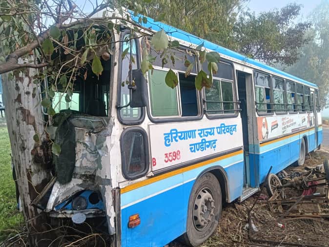 03जेएनडी06: चांदपुर गांव के पास अनियंत्रित बस सड़क किनारे खड़े पेड़ से टकराई। स्रोत : राहगीर