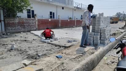 नई अनाज मंडी में सड़क पर ब्लाक बिछाते श्रमिक। संवाद