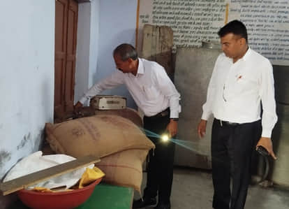राजकीय संस्कृतिक माडल स्कूल में मिड डे मिल राशन की जांच करते हुए बीईओ सुरेंद्र कुमार, साथ में स