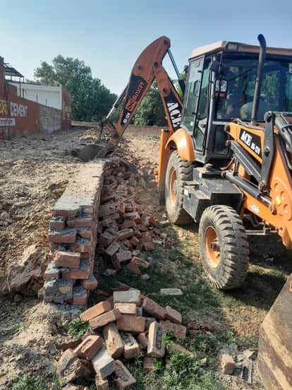 जेसीबी से अवैध निर्माण गिराता चालक। डीटीपी