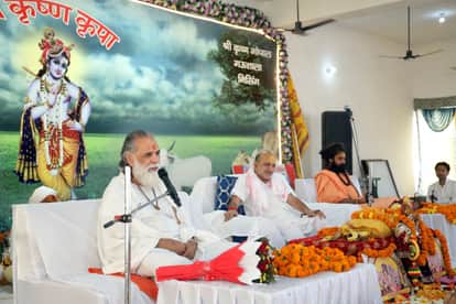 निसिंग गोशाला में आयोजित कथा में प्रवचन करते महामंडलेश्वर गीता मनीषी ज्ञानानंद महाराज। संवा