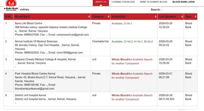 Karnal News: ई रक्तकोष पोर्टल पर पांच ब्लड बैंक पंजीकृत, सिर्फ दो का स्टॉक उपलब्ध