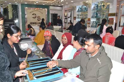 सराफा बाजार में सोने के आभूषण खरीदते ग्राहक। संवाद