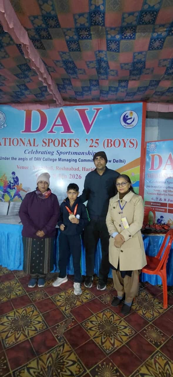 करनाल। राष्ट्रीय स्तर की मुक्केबाजी प्रतियोगिता में अंडर-14 भार वर्ग में जिले की खिलाड़ी यमन संधू ने स्वर्ण पदक जीतकर प्रदेश व जिले का नाम रोशन किया। प्रतियोगिता का आयोजन 8 जनवरी को हरिद्वार में किया गया था। खिलाड़ी सेक्टर-13 के डीएवी पब्लिक स्कूल का छात्र है। विद्यालय की प्रबंधक राकेश संधू ने छात्र को बधाई देते हुए कहा कि यमन की यह सफलता उसके कठोर परिश्रम, अनुशासन एवं निरंतर अभ्यास का परिणाम है। मुख्याध्यापिका आशा चौधरी ने कहा कि इस उपलब्धि से अन्य विद्यार्थियों को भी खेलों में आगे बढ़ने की प्रेरणा मिलेगी।