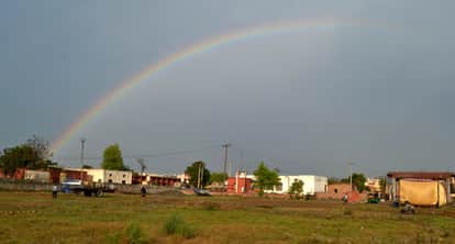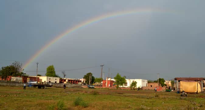 रविवार शाम के समय बड़ा गांव में बारिश के बाद आकाश में बना इंद्र धनुष। संवाद