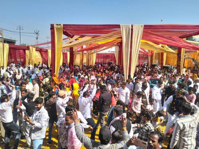 कुरुक्षेत्र। सांस्कृतिक कार्यक्रम के दौरान फूलों की होली खेलते समाज के लोग। स्वयं