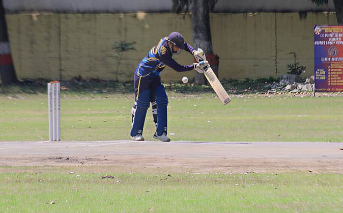महिला क्रिकेट प्रतियोगिता में शाॅट खेलती खिलाड़ी। संवाद