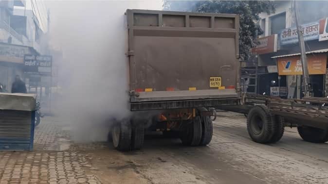 Karnal News: रेत से भरे चलते डंपर के टायर में लगी आग, बचा हादसा