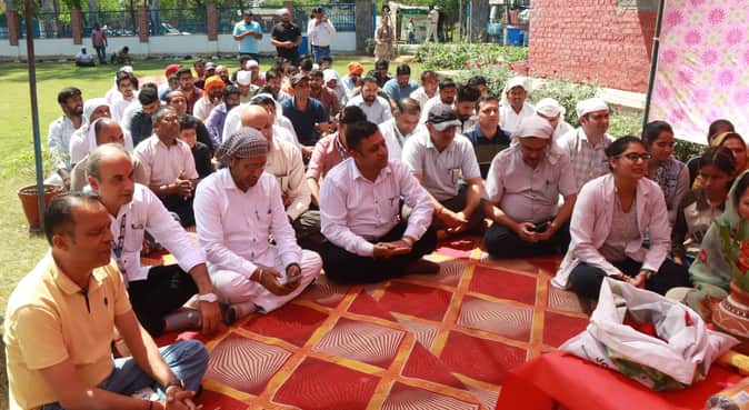 कुरुक्षेत्र। आयुष विश्वविद्यालय में हनुमान जयंती पर पाठ करते कुलपति, अधिकारी और शिक्षक। संवा