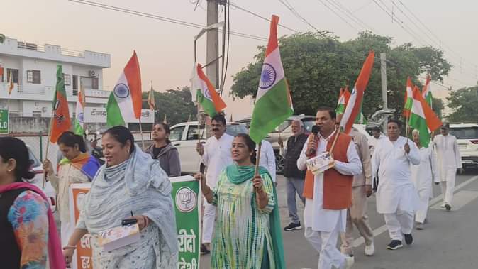 कुरुक्षेत्र। यात्रा में हिस्सा लेते बूथ 145 के कार्यकर्ता। स्वयं
