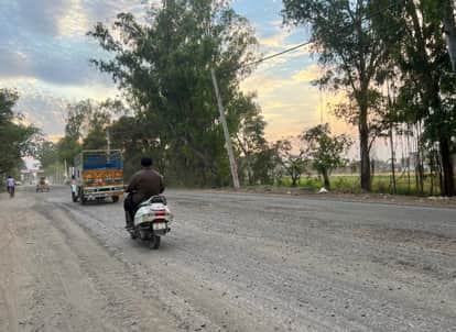 कुरुक्षेत्र। पिपली-लाडवा रोड पर निवारसी मोड़ के निकट उखड़ी सड़क से गुजरते वाहन चालक। संवाद