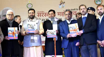 पिहोवा। ‘द सरस्वती रिवर गाथा’’ का विमोचन करने के दौरान प्रति दिखाते मुख्यमंत्री नायब सैनी व अन- फोटो : सुभाष चंद्र बोस को नमन करते किसान नेता।