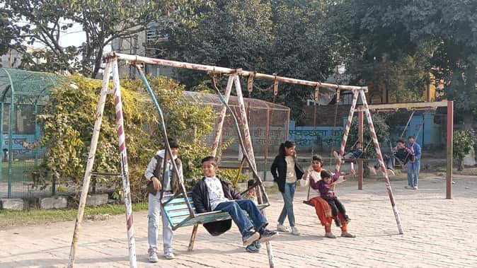 साफ मौसम होने पर पार्क में झूला झूलते बच्चे।