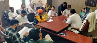 फोटो संख्या:75- नगर पालिका कार्यालय में बजट बैठक करते नगर पालिका प्रधान रमेश सैनी, पार्षद व अ