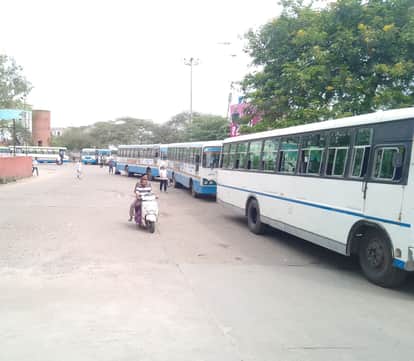 फोटो नंबर- 14रेवाड़ी रूट के लिए कतार में खड़ी बस और स्कूटी से बस स्टैंड के बाहर जाते युवा। सं