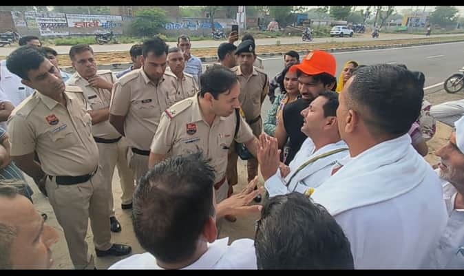 फोटो संख्या:58 आकोदा स्कूल के बाहर ग्रामीणों को समझाते आकोदा चौकी प्रभारी व पुलिसकर्मी। संवाद