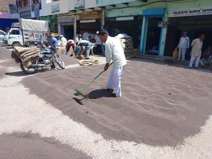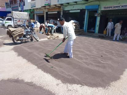 फोटो नंबर- 26मंडी में नमी को सुखाने के लिए सरसों फैलाता किसान। संवाद