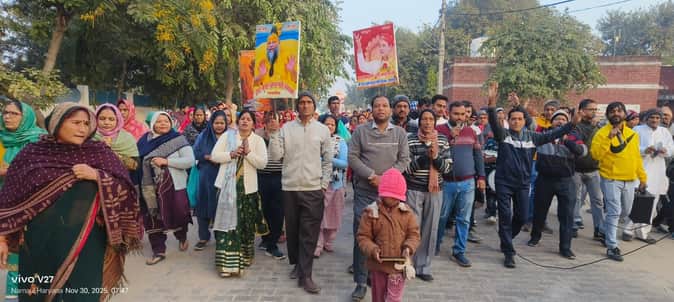 फोटो नंबर-01नसीबपुर के जेठूबाबा मंदिर में प्रभात फेरी निकालते श्रद्धालु। स्रोत-संस्था