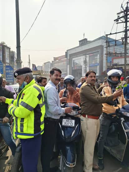 फोटो 03 हेल्मेट व गुलाब का फूल देते पुलिस अधिकारी। संस्थ