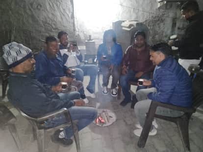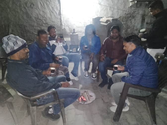 फोटो नंबर-24सर्दी से बचने के लिए अलाव जलाकर चाय की चुस्की लेते लोग। संवाद