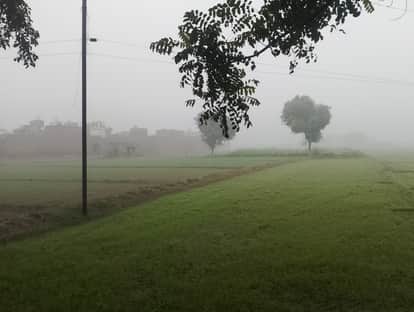 सुबह के समय खेतों में छाई धुंध। संवाद