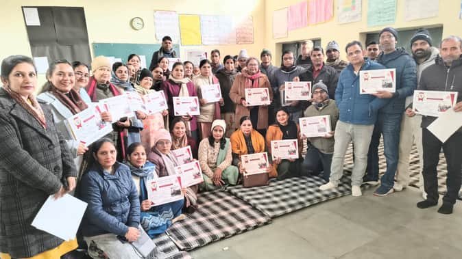 प्राथमिक शिक्षकों के प्रशिक्षण शिविर के समापन पर प्रमाण-पत्र के साथ उपस्थित शिक्षक।