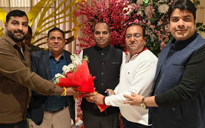 संस्था के प्रधान दिलावर खर्ब व हेमंत शर्मा का स्वागत करते प्रधान राजन कपूर। स्रोत : समिति
