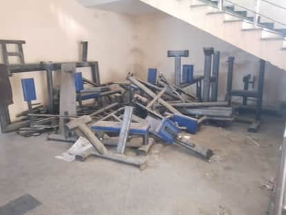 स्टेडियम में पड़े उपकरण। संवाद- फोटो : अपनी बिटिया सुषमा को मैगलगंज से परीक्षा दिलाने आईं श्यामा कुमारी।