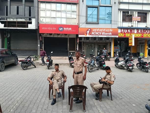 सेक्टर-11-12 में स्थित कोटेक महिंद्र बैंक की शाखा के बाहर तैनात पुलिस। संवाद