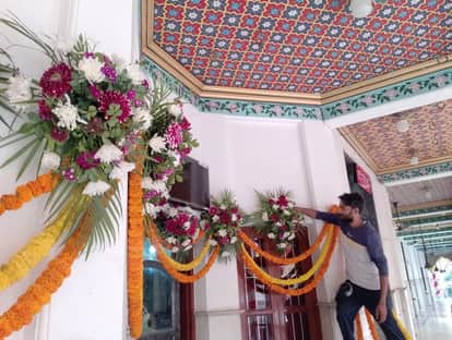 देवी मंदिर में फूलों से दरबार को सजाते कलाकार। संवाद