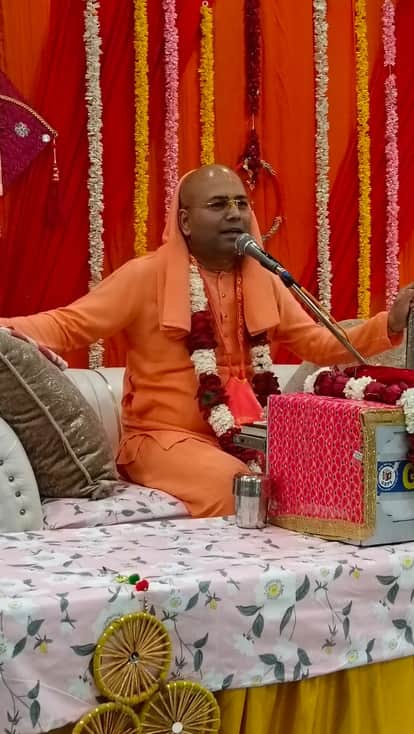 मंदिर में कथा करते तेजस्वी दास महाराज। मंदिर