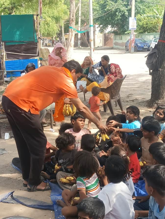 बच्चों को केला वितरित करते कंवर सैनी। स्रोत : संस्था