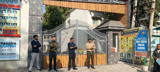 होली चाइल्ड स्कूल के बाहर तैनात सुरक्षाकर्मी। संवाद