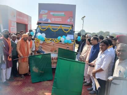 तीन रथों को हरी झंडी दिखाकर रवाना करते मंत्री किरोड़ी लाल। संवाद