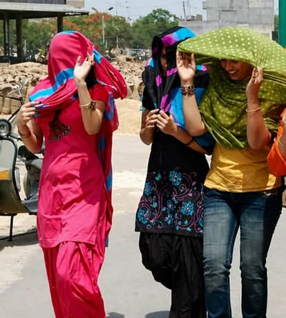 गर्मी में धूप से बचने के लिए चुन्नी का सहारा लेतीं युवतियां। संवाद