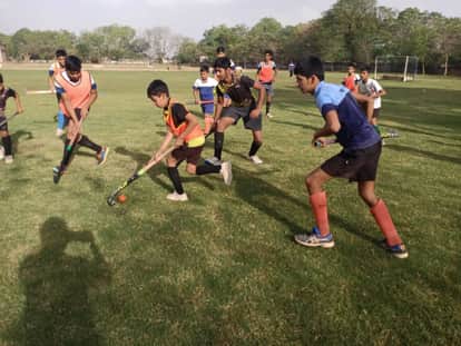 हॉकी नर्सरी के लिए ट्रायल में भाग लेते खिलाड़ी। स्रोत : कोच