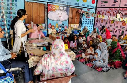 आंगनबाड़ी में पोषण पखवाड़ा कार्यक्रम में बच्चों को प्रारंभिक शिक्षा और पोषण आहार के बारे में जा