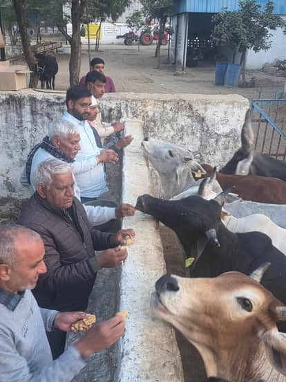 गाय को चारा खिलाते जिला परिषद के चेयरमैन मनोज यादव। स्रोत : प्रवक्ता