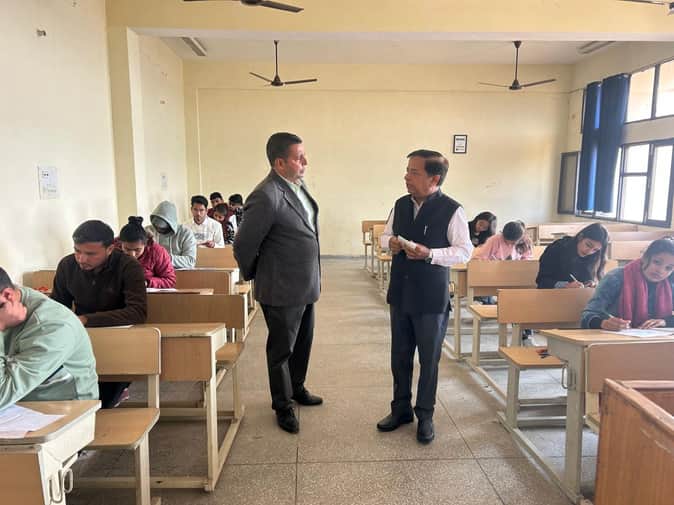 परीक्षा केंद्र का निरीक्षण करते कुलपति प्रोफेसर असीम मिगलानी। स्रोत : विवि
