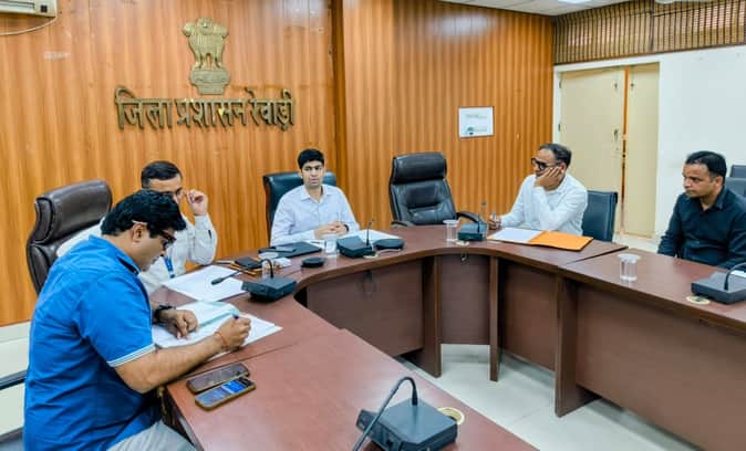 रेवाड़ी। जिला स्तरीय कार्यान्वयन एवं निगरानी कमेटी की समीक्षा बैठक करते डीसी अभिषेक मीणा। स्रोत