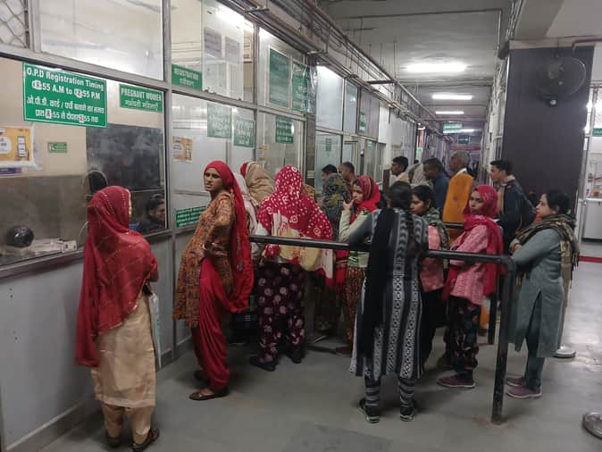 फोटो: 29रेवाड़ी। नागरिक अस्पताल में ओपीडी की पर्ची कटवाते लोग। संवाद
