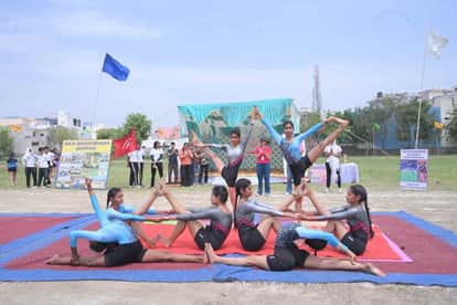 05-एमकेजेके कॉलेज में आयोजित वार्षिक एथलेटिक्स मीट के दौरान योगा करती छात्राएं। स्रोत- कॉलेज