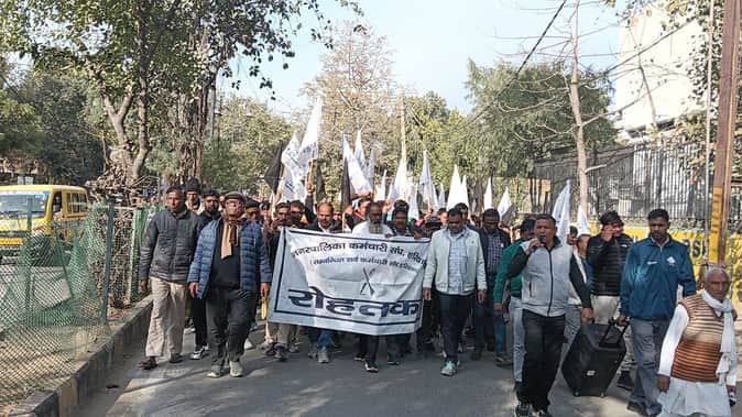 14-कच्चे कर्मचारियों काे पक्का करने व स्थायी भर्ती सहित तमाम मांगों को लेकर प्रदर्शन करते नगर
