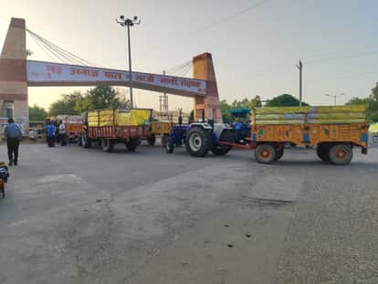 45-मंडी में सर्वर डाउन होने के कारण गेट पर इंतजार करती ट्रैक्टर ट्राली। संवाद